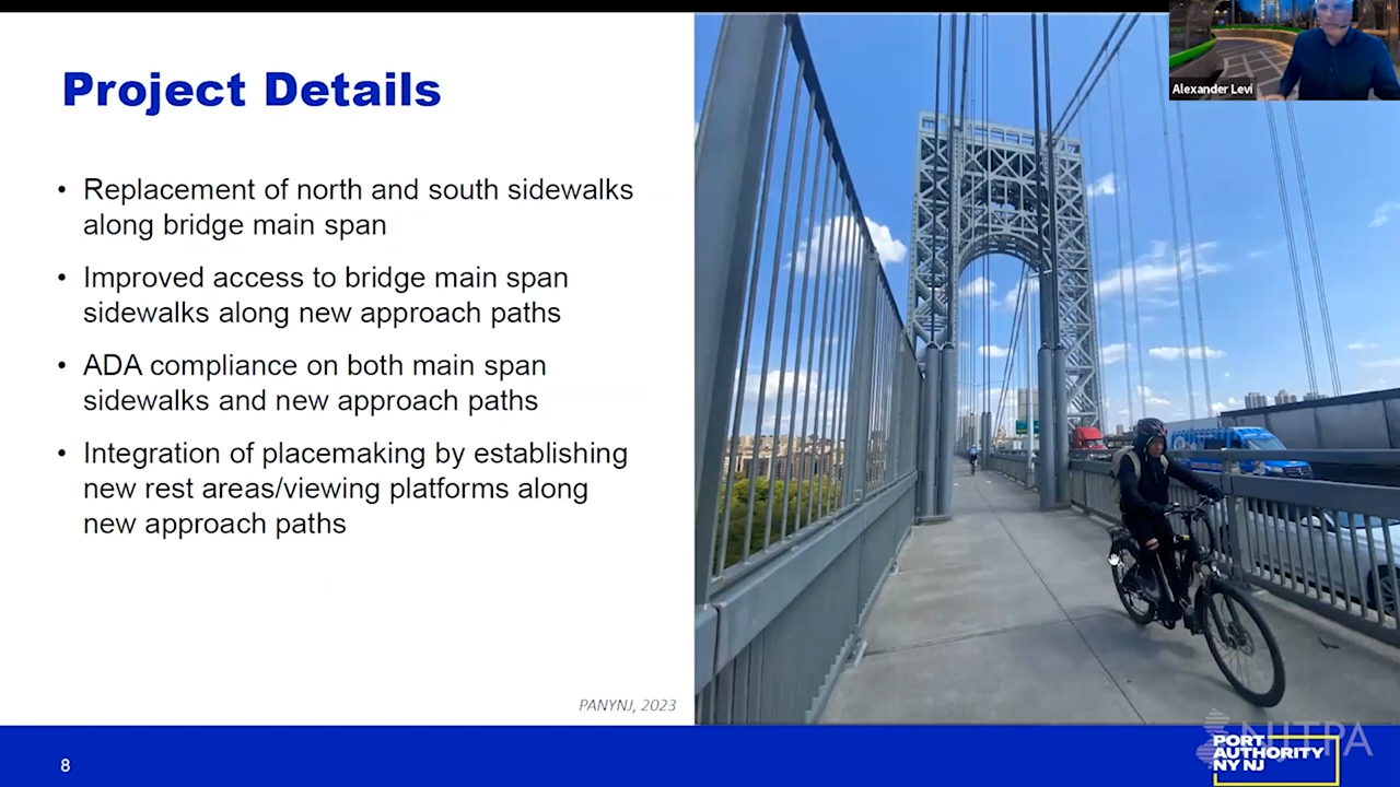 Watch Video →Presentation by Alexander Levi, Port Authority of NY & NJ, on bicycle and pedestrian access improvements made on the George...